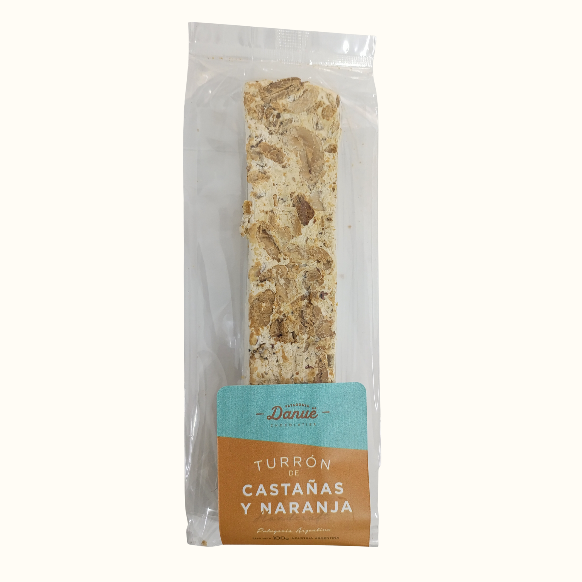 Un turrón artesanal que combina castañas tostadas con el toque cítrico y perfumado de la naranja natural, logrando un equilibrio perfecto entre dulzor, textura y frescura. Cada bocado ofrece una mezcla deliciosa de crocante, suavidad y aroma, elaborada con ingredientes seleccionados y la esencia patagónica que distingue a Patagonia Danüé.